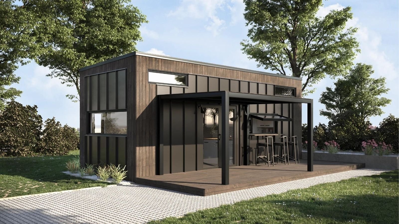 Maison modulaire avec mezzanine – 37 m² en standard clé en main. Maison modulaire utilisable toute l’année, parfaite pour les vacances, les locations ou les chambres d’hôtes. Sa construction en acier et ses panneaux stratifiés la rendent durable et stable. L’élégante façade anthracite avec des détails en bois et de grandes fenêtres assure un look moderne et beaucoup de lumière naturelle.