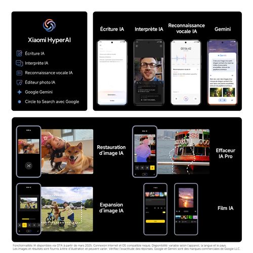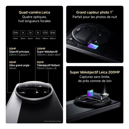 Quad-caméra LeicaQuatre optiques, huit longueurs focales.Grand capteur 1’’ Parfait pour les photos de nuit.Téléobjectif périscopique Leica 200MP Capturez sans limite, de près comme de loin.Xiaomi HyperAIDes clichés sublimés par l’IA.